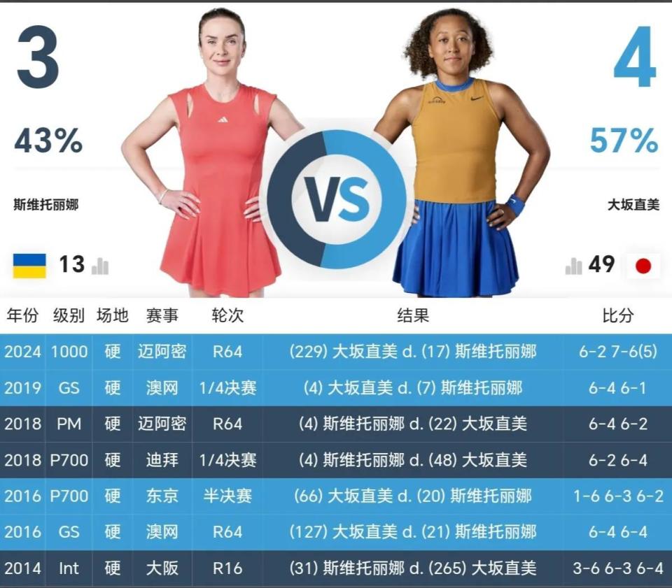 维基体育平台两位球员此前有过7次交手记录,大阪直美4胜3负略占上风并且赢得最近的两次交手。